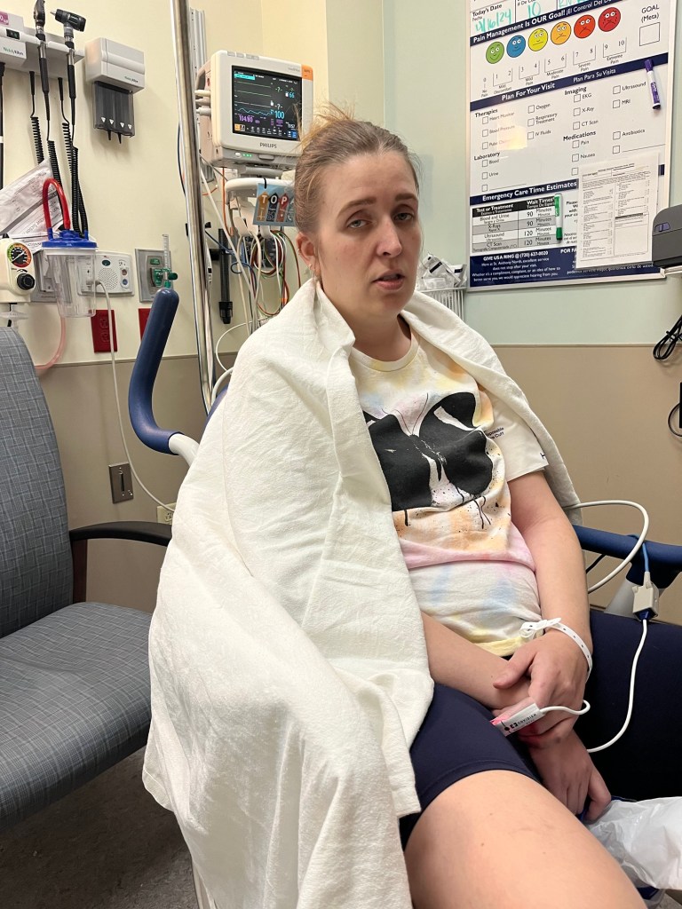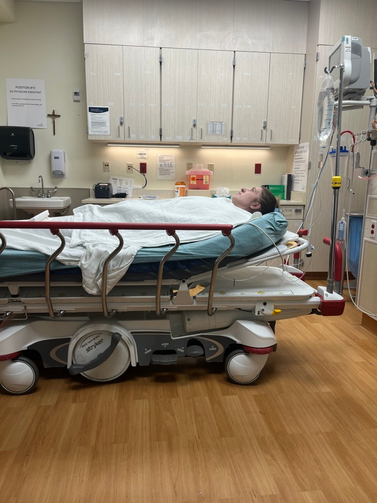 They transferred me to a hospital bed in that room when I got there. One of those beds with wheels for transport. As soon as I was in that bed, the head/charge nurse came in and introduced herself and got me attached to a bunch of EKG stickers to monitor me. That felt pretty serious too. Then she moved the bed head part so I was laying down. She said something like “this’ll help” and again that felt pretty serious. They threw another blanket on me because truly nothing felt good enough. I was so cold and my body was shaking.